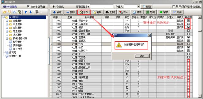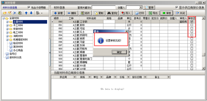 在金石工程管理軟件中可對添加的“材料信息”進(jìn)行審核(此功能為可選功能)。如圖: