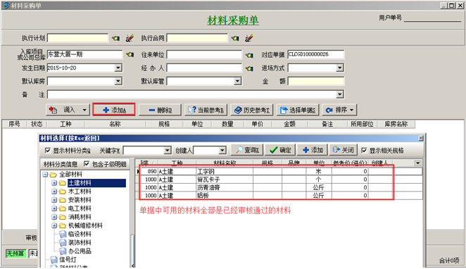 審核通過的“材料信息”可在系統(tǒng)業(yè)務(wù)單據(jù)中可用,如圖: