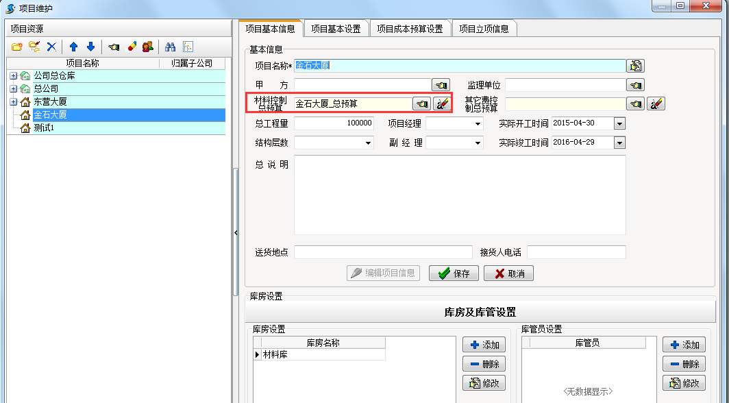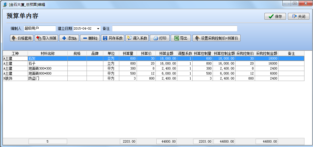 如圖在工程項目管理系統(tǒng)中建立一個金石大廈的材料預算單
