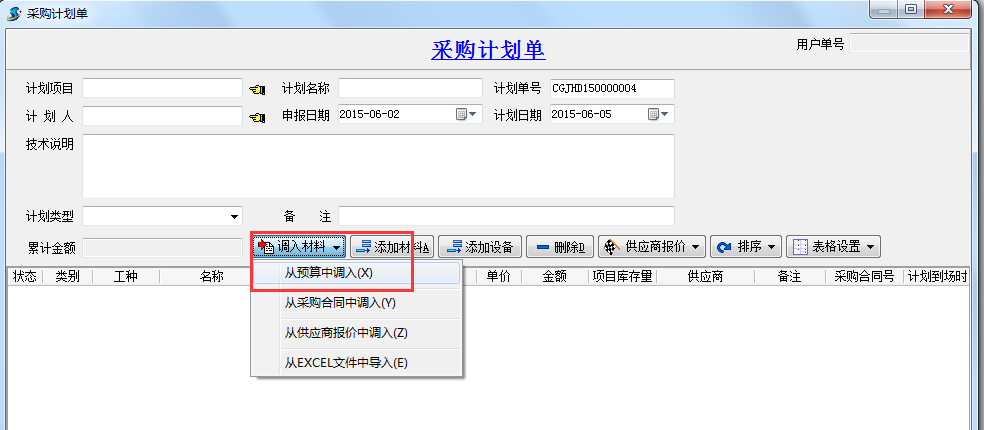 在工程項目管理系統(tǒng)中新建采購計劃單時,添加材料內容選擇從預算中調入,如下圖