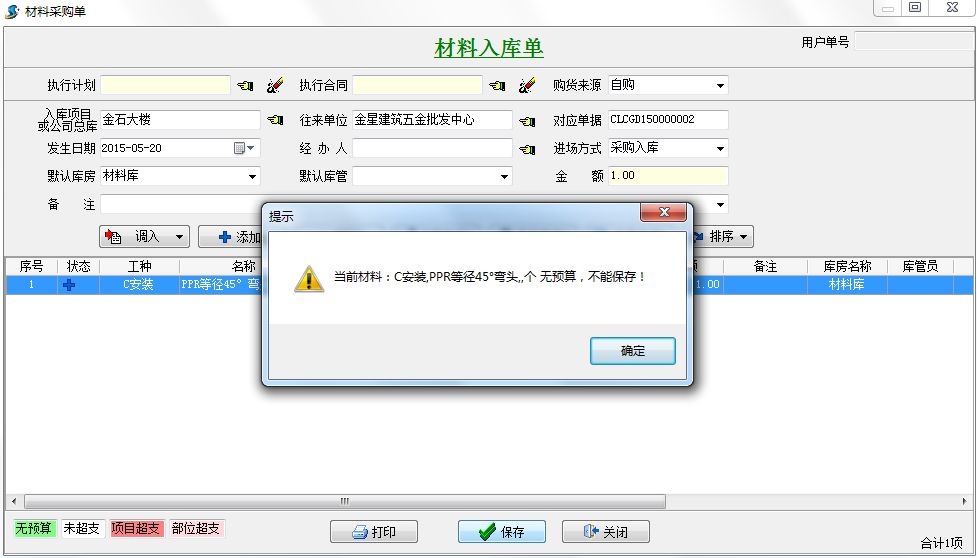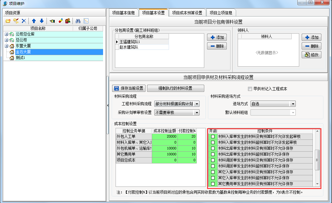 在工程項目管理系統(tǒng)中選好控制條件在開啟處打上勾。例如我們選定材料入庫單發(fā)生的材料沒有預算不能允許保存。
