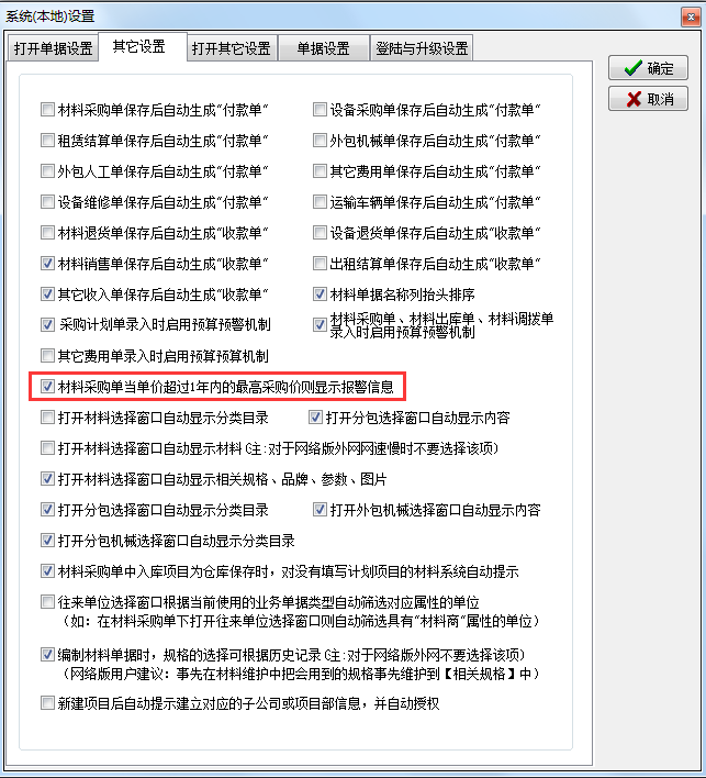 備注:獲得此項提示需要打開開關【系統(tǒng)維護】-【系統(tǒng)本機設置】-[其他設置]- 在[材料采購單當單價超過一年內的最高采購價則顯示報警信息]處打上勾 。如下圖