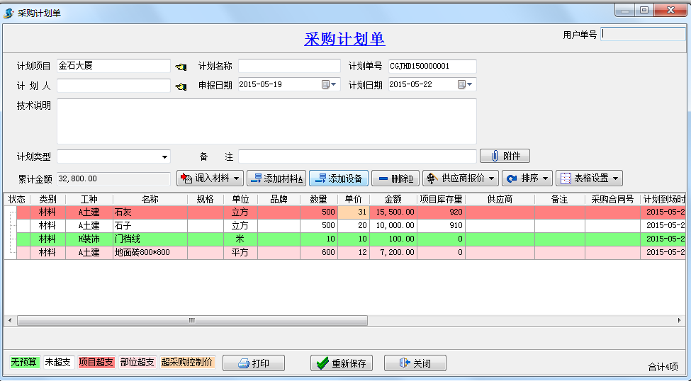 綁定好項目之后,在填寫材料相關單據(jù)時,會根據(jù)預算單的價格和數(shù)量進行不同顏色的顯示。這里我們以采購計劃單為例進行說明。