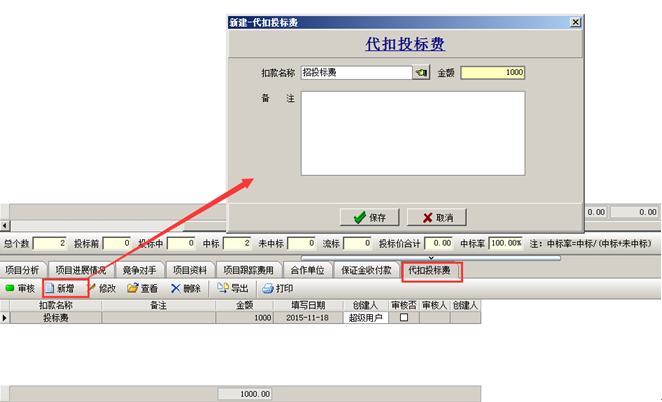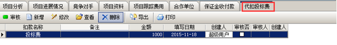 各項設置添加完成之后,在工程管理軟件的項目開拓列表里面會顯示“投標待辦”(例如項目的投標保證金),如圖: