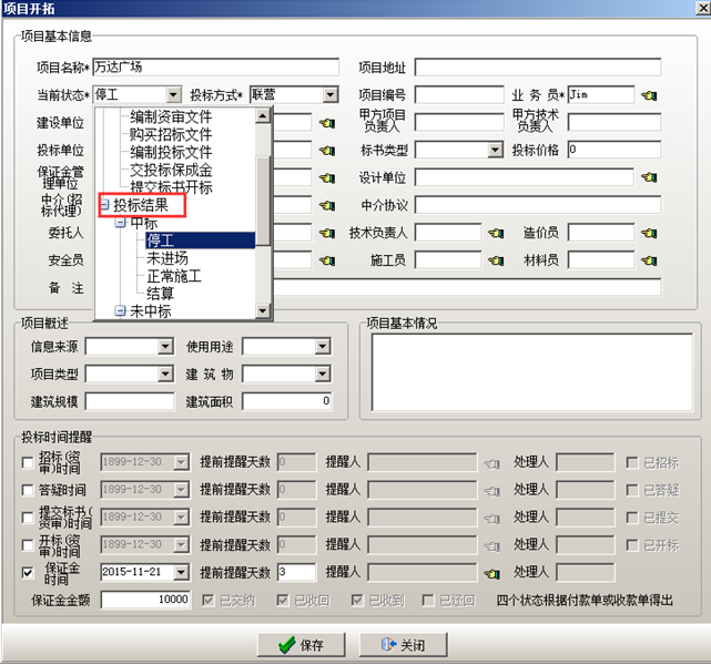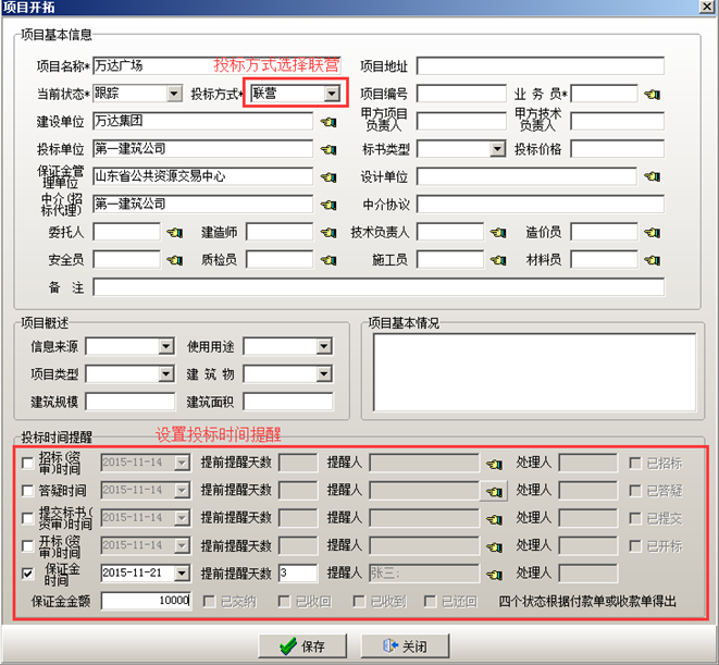 項目狀態(tài)編輯維護完成之后可在工程管理軟件中建立項目。在工程管理軟件的“項目開拓”中輸入包括個往來單位以及負責人等項目基本信息。也可在投標時間提醒里面設置“招標(資審)時間”,“答疑時間”,“提交標書時間”,“開標時間”,“保證金”提醒時間,時間設置完成之后,被提醒的用戶會在相應的時間收到相關的提醒內(nèi)容。投標保證金,在投標保證金對應的復選框打鉤,設置投標保證金的時間,提前提醒的天數(shù),被提醒人以及金額。如圖所示: