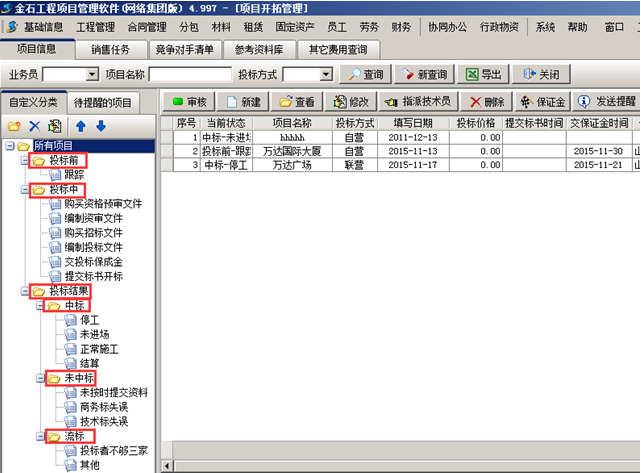 在金石工程管理軟件中,項目是在系統(tǒng)的“項目開拓”中建立項目開始的。 根據(jù)項目所處的階段在工程管理軟件的項目開拓中建立項目基本信息。工程管理軟件中項目開拓階段項目有三個狀態(tài):“投標前”、“投標結(jié)果”,“投標結(jié)果”包括“中標”、“未中標”和“流標”,系統(tǒng)定義的項目的基本狀態(tài)不可編輯或更改,若項目有其他狀態(tài)可在個基本狀態(tài)下建立子狀態(tài),子狀態(tài)的名字可進行編輯。如圖所示: