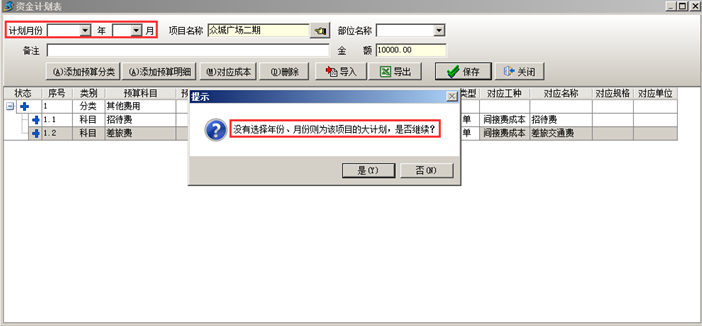在工程管理軟件的資金計劃單中若選擇計劃月份,則資金計劃表為本項目當(dāng)月的資金計劃,若不填月份,則資金計劃表默認(rèn)為本項目的總的預(yù)算,工程管理軟件會給出相應(yīng)的提示。如圖: