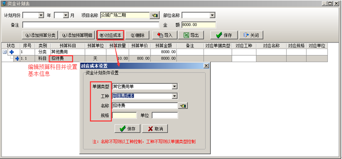 (2)在分類下面添加詳細(xì)的“預(yù)算明細(xì)”,此時要給預(yù)算明細(xì)設(shè)置“對應(yīng)成本”,在“對應(yīng)成本設(shè)置的對話框”設(shè)置資金計劃條件,選擇“單據(jù)類型”、“工種”以及“規(guī)格”,