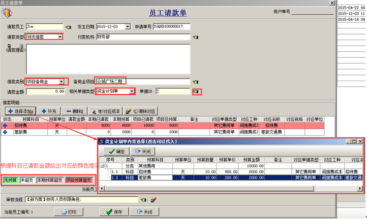 注:預(yù)算明細(xì)添加到請款單中,則系統(tǒng)會自動計算當(dāng)前項目在對應(yīng)預(yù)算科目下的已借款金額,對比資金計劃單中的預(yù)算金額,以不同的顏色提示用戶是否超支(本期預(yù)算超支或項目預(yù)算超支)。如圖: