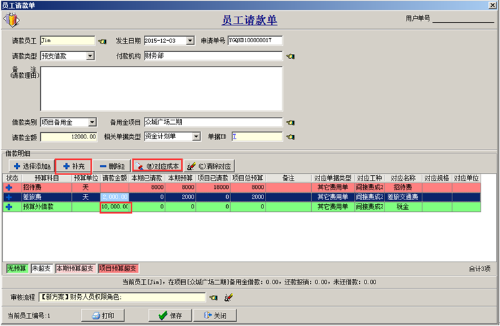 如果需要申請的預(yù)算科目在工程管理軟件的資金計劃單中沒有設(shè)置,可在“員工請款單中”進(jìn)行補(bǔ)充,點(diǎn)擊“補(bǔ)充”按鈕,對應(yīng)成本并輸入請款金額。在“員工請款單”申請項目備用金時。單據(jù)中補(bǔ)充的無預(yù)算的科目以“預(yù)算外借款”顯示顏色為綠色。如圖: