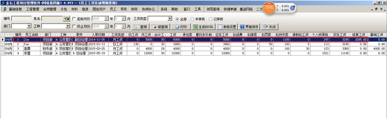 工程管理軟件工資表生成之后員工在不同項(xiàng)目上出勤的工資會(huì)生成到同一張工資表中,如圖: