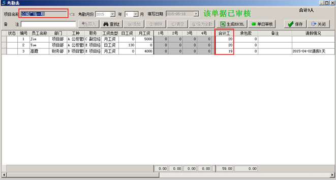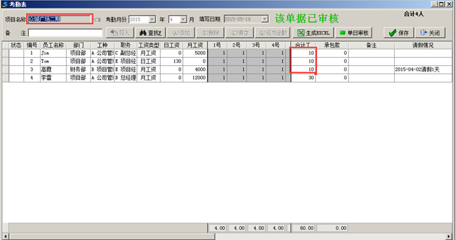 例如,Jim、Tom、高霞都是在同月出勤了兩個(gè)項(xiàng)目“眾城廣場(chǎng)一期”和“眾城廣場(chǎng)二期”,則在工程管理軟件中四月份分別做兩給項(xiàng)目的考勤表。如圖: