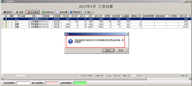 如果想取消結(jié)算,則選中對(duì)應(yīng)的員工工資信息,點(diǎn)擊“取消結(jié)算”的按鈕,確認(rèn)取消結(jié)算,則員工工資信息會(huì)恢復(fù)到未結(jié)算狀態(tài),如圖: