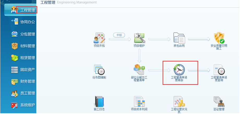 1、 形象進(jìn)度填報(bào)(上報(bào)給甲方的進(jìn)度),通過(guò)-【工程量清單進(jìn)度填報(bào)】,如圖: