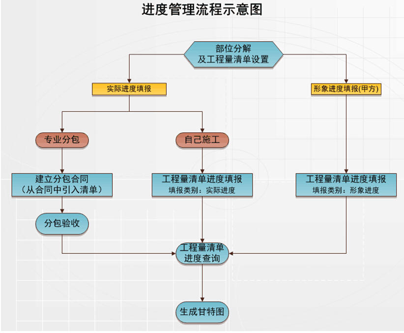 項(xiàng)目進(jìn)度查詢(xún)時(shí),系統(tǒng)會(huì)根據(jù)項(xiàng)目部分以及工程量清單匯總項(xiàng)目進(jìn)度。如圖: