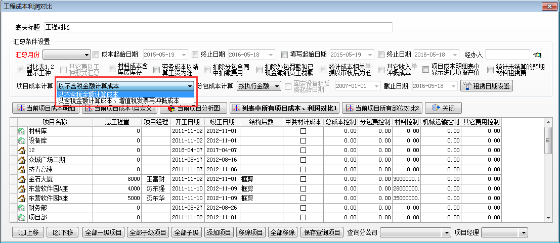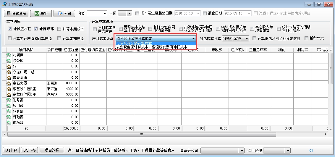 ⑵.營改增后項目成本利潤和工程經營狀況表可以選擇以“不含稅金額計算成本”或者“以含稅金額計算成本、增值稅發(fā)票在沖抵成本”兩種方式。如下圖: