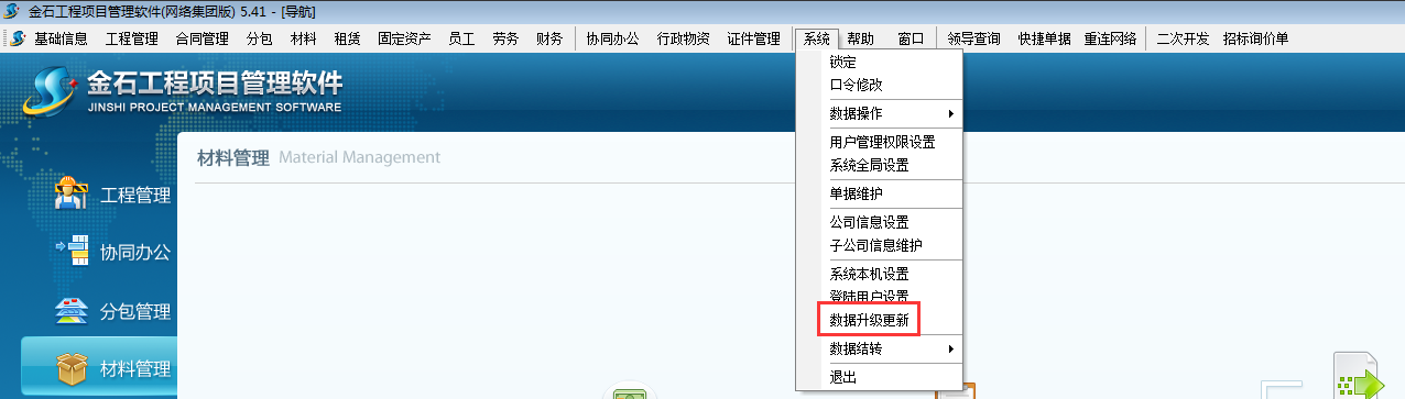 備注:升級到最新版本后,需要登錄超級用戶點擊主菜單【系統(tǒng)】-【數據升級更新】。如下圖: