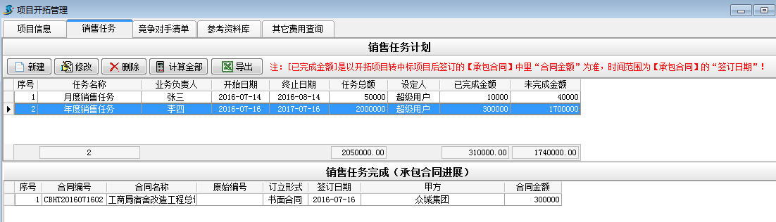 如上圖建立一個業(yè)務(wù)負(fù)責(zé)人為李四,任務(wù)總額為2000000的年度銷售任務(wù)。其中[已完成金額]是以開拓項目轉(zhuǎn)中標(biāo)項目后簽訂的【承包合同】中里的“合同金額”為準(zhǔn),時間范圍為【承包合同】的“簽訂日期”![未完成金額]是[任務(wù)金額]減去[已完成金額]得出的金額。具體操作如下: