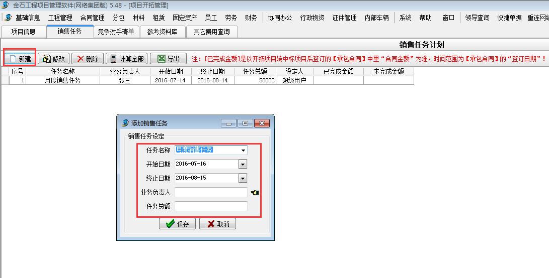 首先在施工項目管理軟件【項目開拓】-【銷售任務(wù)】處新建銷售任務(wù)計劃。如下圖: