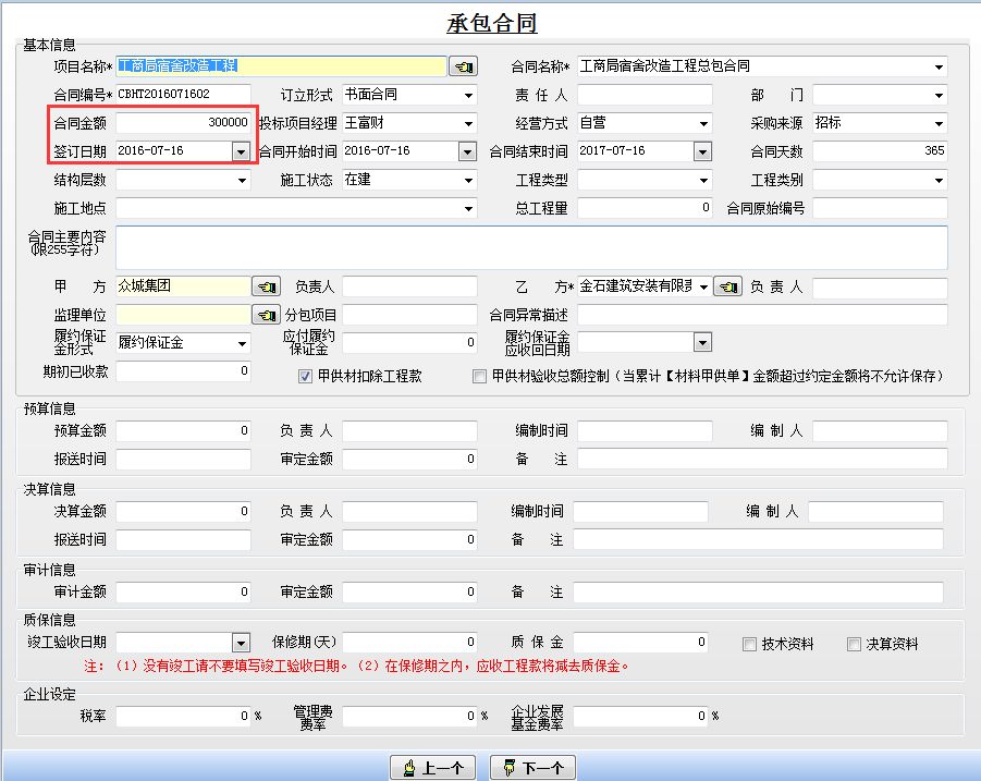 填寫好相應(yīng)的項目信息后,建立施工項目管理軟件承包合同。