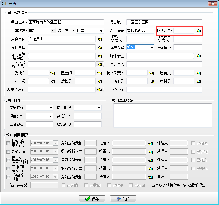 在施工項目管理軟件項目開拓建立開拓項目,【項目開拓】中業(yè)務(wù)員必須要與【銷售任務(wù)】中業(yè)務(wù)負(fù)責(zé)人一致。如下圖: