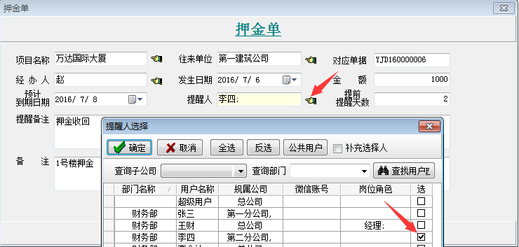 1.建立押金單、押金提醒(導(dǎo)入附件)->審核確認(支持多級審核)