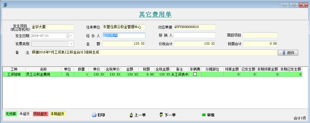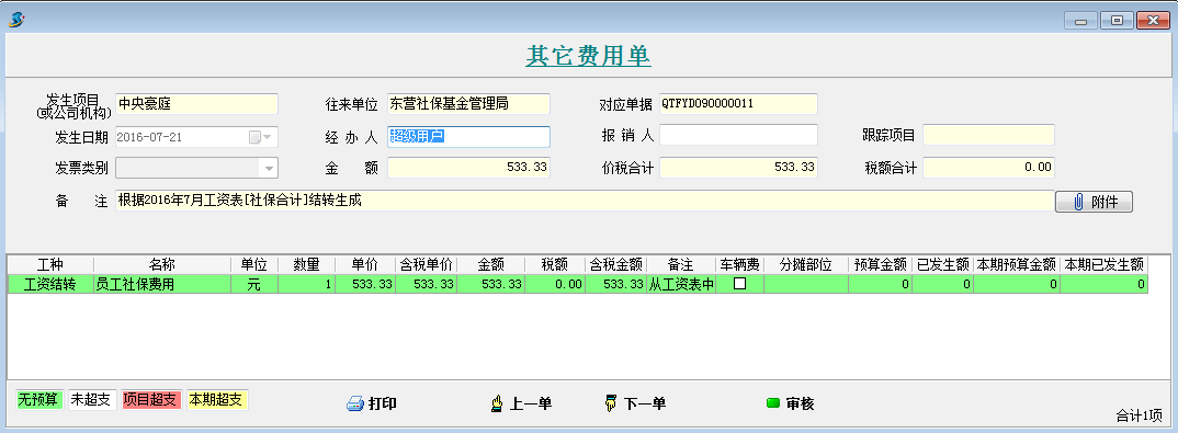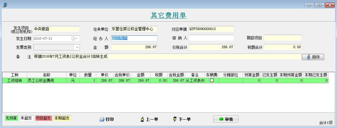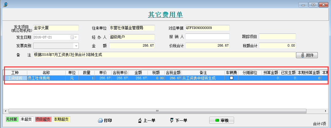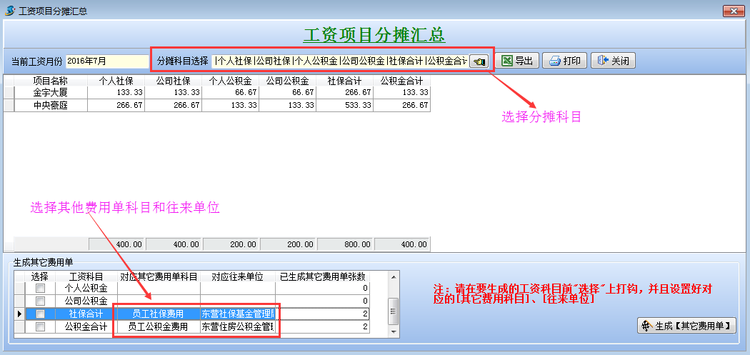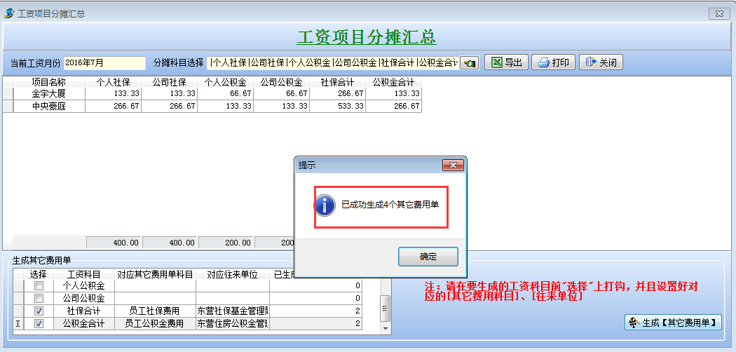 打開待攤費(fèi)用模塊,選擇好分?jǐn)偪颇浚斜碇芯蜁@示出每個項(xiàng)目分?jǐn)偪蛻舻拿骷?xì)。同時(shí)在這個模塊可以直接生成其它費(fèi)用單,選擇好社保合計(jì)和公積金合計(jì)的對應(yīng)其它費(fèi)用單科目和對應(yīng)往來單位,點(diǎn)擊生成工程項(xiàng)目管理系統(tǒng)【其它費(fèi)用單】,直接可以生成四張其他費(fèi)用單。