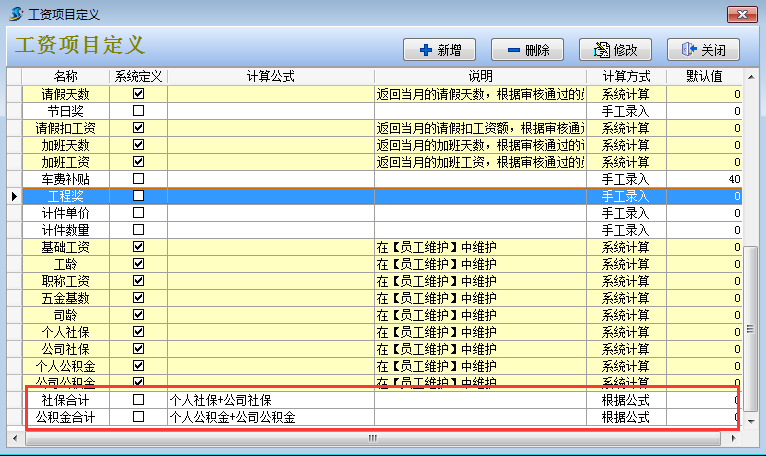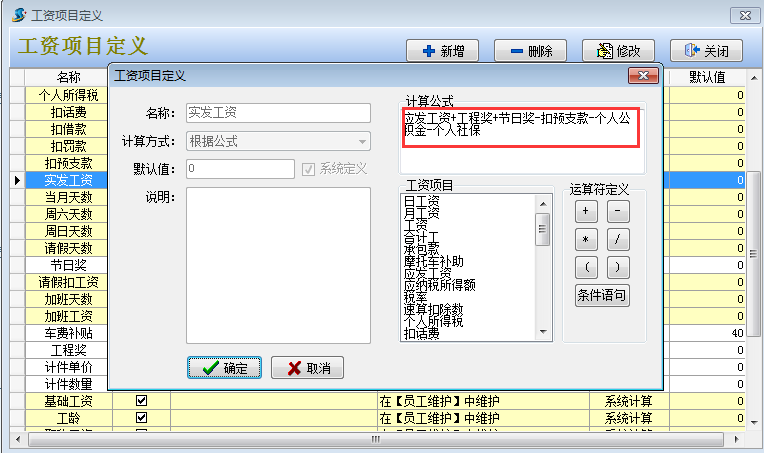2. 然后在工程項(xiàng)目管理系統(tǒng)【員工管理】-【工資項(xiàng)目定義】設(shè)定好實(shí)發(fā)工資的公式和新增社保合計(jì),公積金合計(jì)兩個工資科目。其中實(shí)發(fā)工資公式中要減去個人社保和個人公積金。如下圖:
