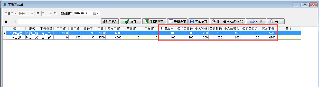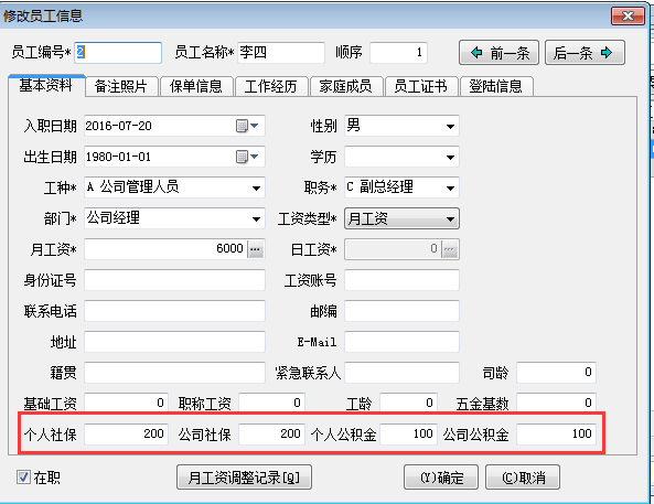 1. 首先在工程項(xiàng)目管理系統(tǒng)員工維護(hù)填寫好個人社保,公司社保,個人公積金,公司公積金相應(yīng)的金額。如下圖: