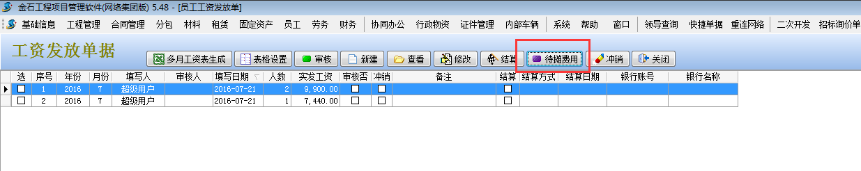 工資表保存后,選擇工程項(xiàng)目管理系統(tǒng)【待攤費(fèi)用】模塊。如下圖: