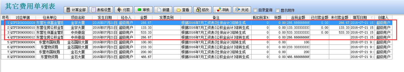 回到【財(cái)務(wù)管理】其它費(fèi)用單列表,就會看到這四張其它費(fèi)用單。
