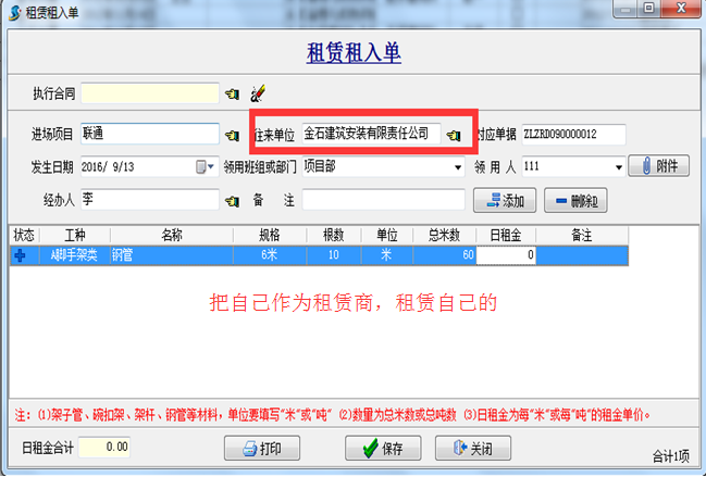 首先自己的東西,可以自己當(dāng)成租賃商自己租給自己,使得期初軟件有自己的材料庫(kù)存!