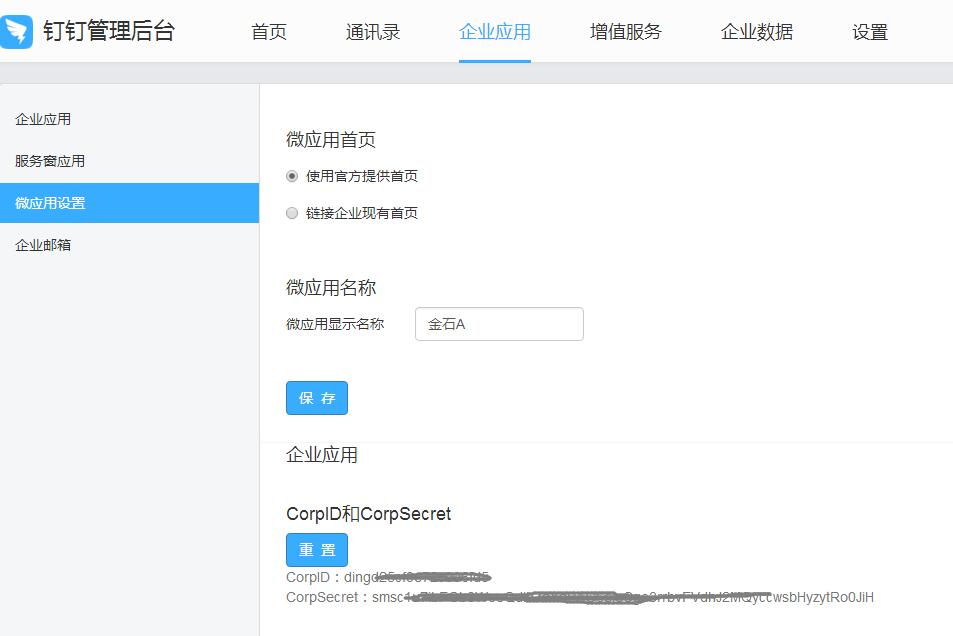 4. 獲取corpid, corpsecret和agentid好后登陸超級(jí)用戶在【系統(tǒng)維護(hù)】-【系統(tǒng)全局設(shè)置】-【企業(yè)認(rèn)證設(shè)置】填寫釘釘認(rèn)證信息。(此處需要開發(fā)商授權(quán))