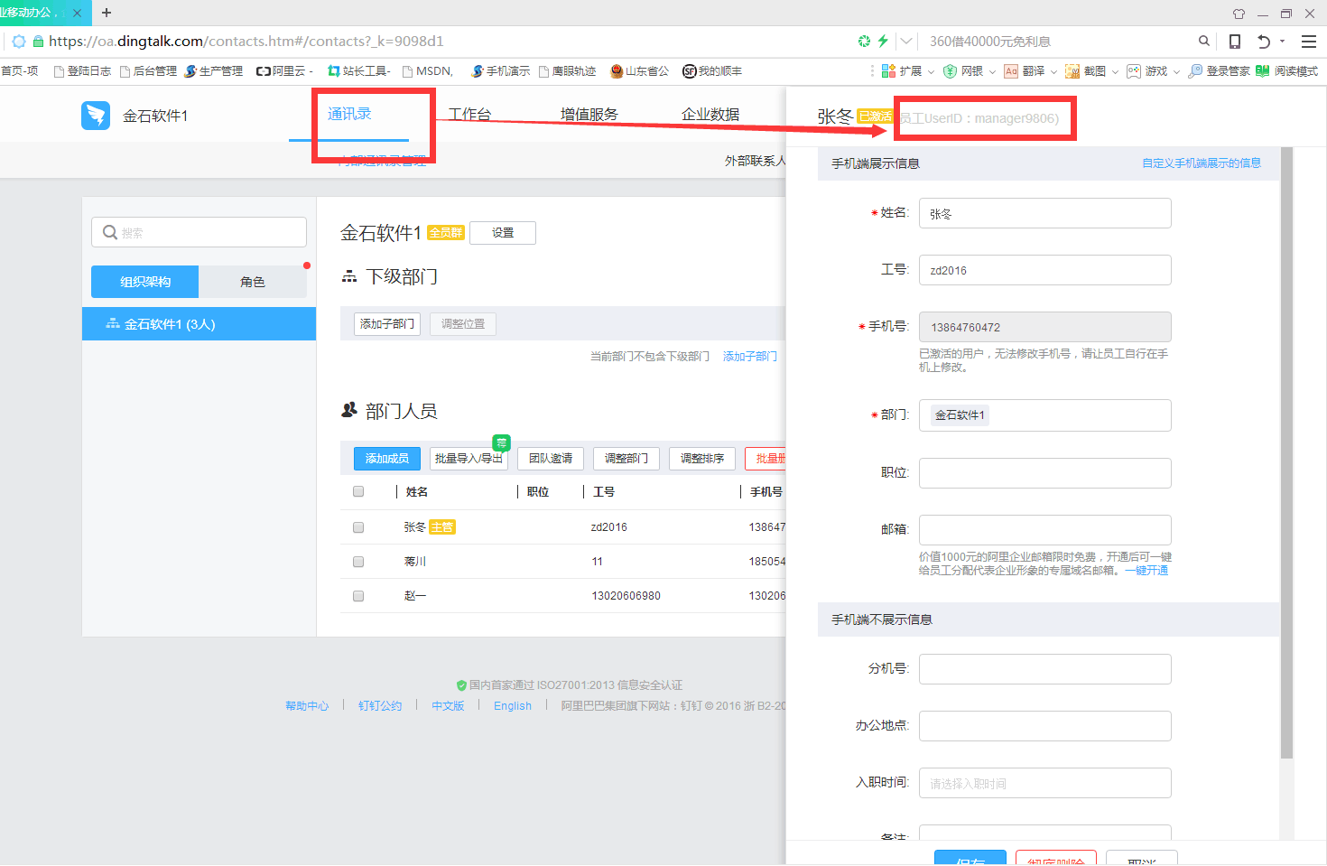 ⑶ 在金石軟件【系統(tǒng)維護(hù)】-【用戶管理權(quán)限設(shè)置】中設(shè)置每個(gè)使用用戶的釘釘賬號(hào)為釘釘管理后臺(tái)中通訊錄成員的員工UserlD。