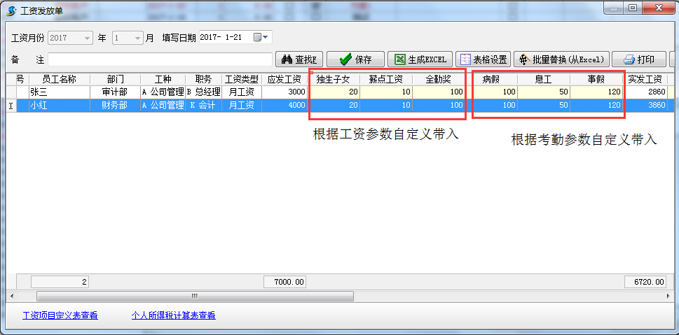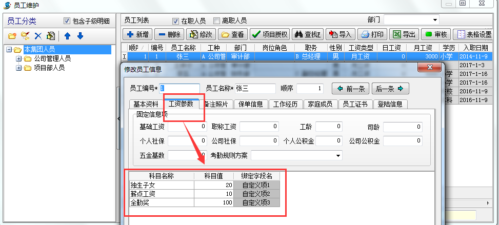 在工資表中我們已經(jīng)做了工資參數(shù),但往往因一些公司工資計(jì)算方式比較特殊導(dǎo)致不夠用,現(xiàn)增加了工資自定義功能用法如下