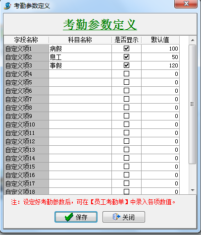 在考勤表中我們已經(jīng)做了考勤參數(shù),但往往因一些公司考勤方式比較特殊導(dǎo)致不夠用,現(xiàn)增加了考勤自定義功能用法如下: