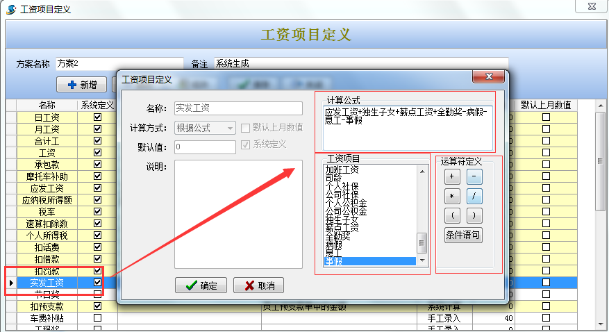 雙擊選擇實(shí)發(fā)工資,通過(guò)工資項(xiàng)目和運(yùn)算符定義編輯計(jì)算公式(運(yùn)算字符一定要用鼠標(biāo)點(diǎn)擊下圖運(yùn)算符定義選擇,不能用鍵盤(pán)直接輸入)