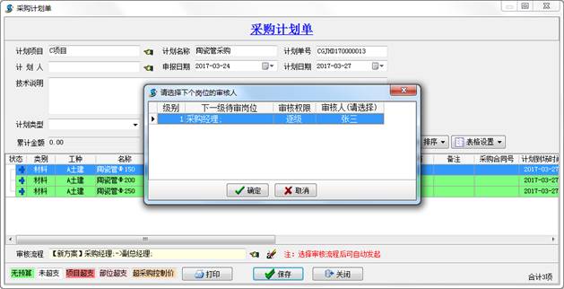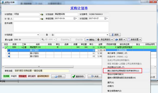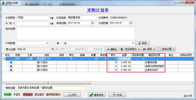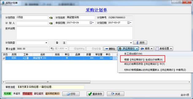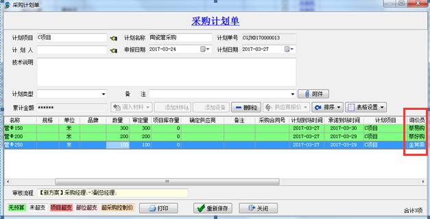 2、新建采購計(jì)劃單,選擇項(xiàng)目、輸入計(jì)劃名稱和添加材料后,選擇審核方案à新方案。如下圖,