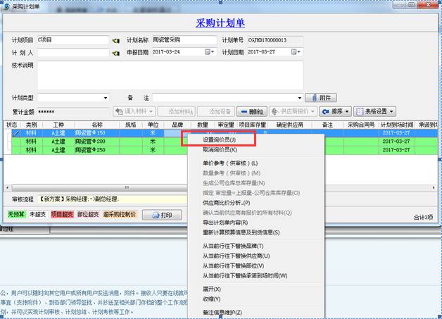 在彈出的待審核單據(jù)à材料計(jì)劃單,點(diǎn)擊修改按鈕,彈出材料計(jì)劃單,在材料行位置右擊鼠標(biāo),對(duì)特定材料設(shè)置詢價(jià)員,操作如下