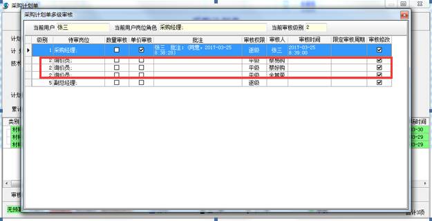這樣你會(huì)看到在原先的審核級(jí)別中會(huì)自動(dòng)插入了3個(gè)詢價(jià)員的平級(jí)審核,3個(gè)詢價(jià)員會(huì)同時(shí)收到審核提醒信息。