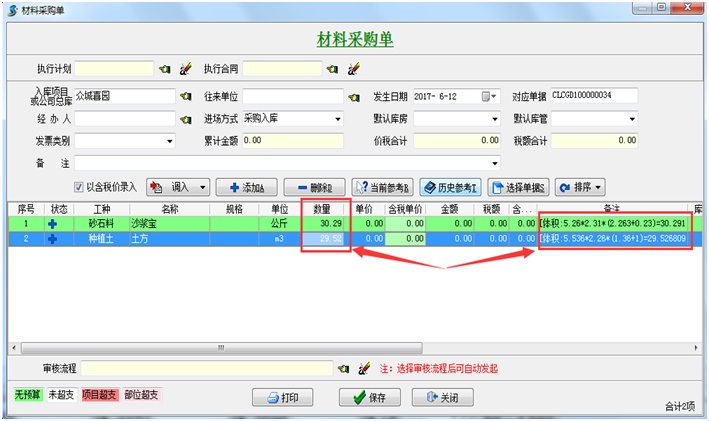 備注 如上圖所示:在備注欄中系統(tǒng)不但會自動彈出材料的計算方式,而且在數(shù)量一欄中只保留2位小數(shù),并將第三位以后的數(shù)字舍去,以幫助公司節(jié)省開支