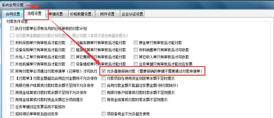 流程設(shè)置→允許直接報(bào)銷付款打鉤(需要報(bào)銷的單據(jù)不需要通過付款申請單)