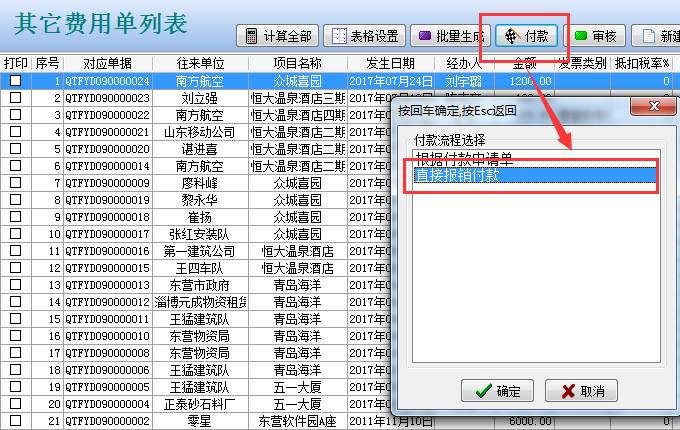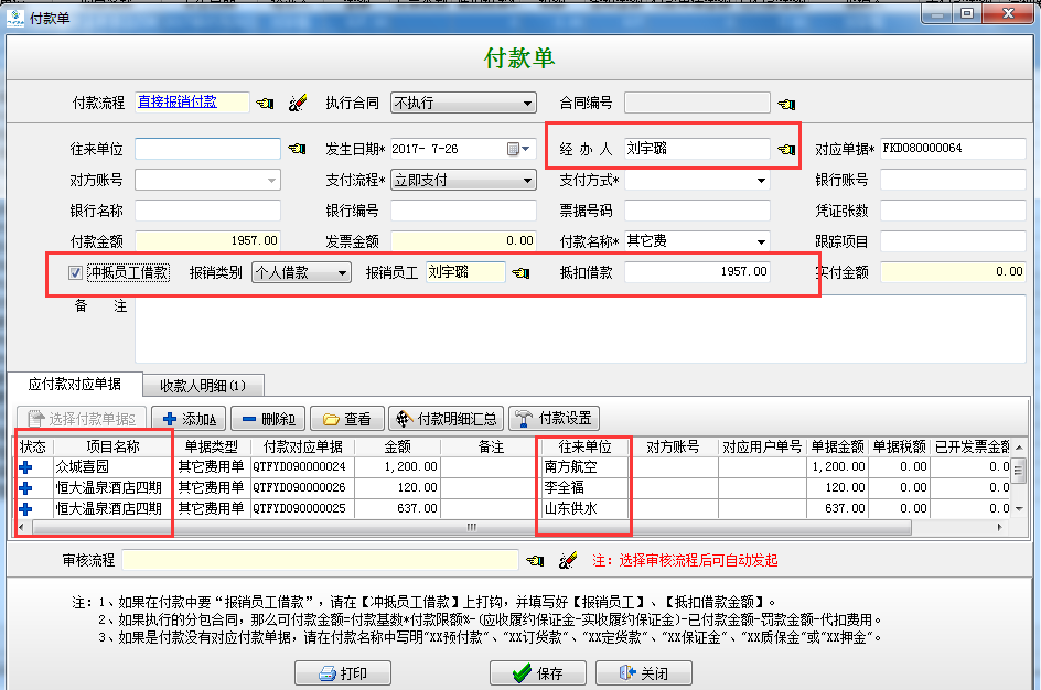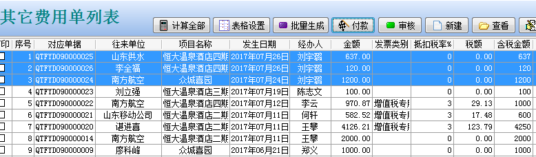 在工程項(xiàng)目管理軟件中如果某個員工在多個項(xiàng)目任職,又有多個往來單位都產(chǎn)生業(yè)務(wù)往來,都要進(jìn)行報(bào)銷付款(沒有對應(yīng)合同的前提下),按住ctrl鍵選擇待付款的單據(jù)(需單據(jù)的經(jīng)辦人是相同的)