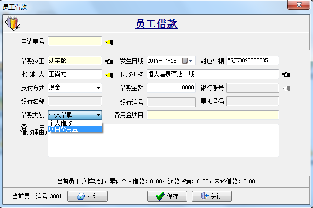 備注:員工借款分為個人借款和項(xiàng)目備用金,其中選擇項(xiàng)目備用金主要用于大額的采購,是??顚S玫?,不能用于其他項(xiàng)目