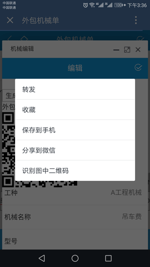2、金石工程管理軟件手機(jī)端也可以生成二維碼,在配置好企業(yè)微信的前提下,進(jìn)入手機(jī)端的單據(jù)填寫并打開外包機(jī)械單,如圖所示