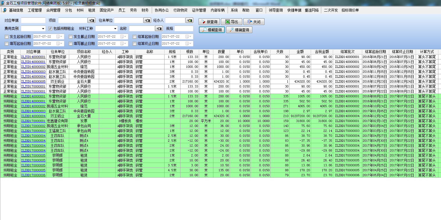 在租賃管理方便,經(jīng)常租一些周轉(zhuǎn)材料,跟租賃公司都是長(zhǎng)期合作,結(jié)算方式都是采用季度結(jié)算或者年度結(jié)算,之前采用紙質(zhì)或者excel統(tǒng)計(jì),統(tǒng)計(jì)并不準(zhǔn)確,到季度或者年度結(jié)算時(shí)往往統(tǒng)計(jì)不準(zhǔn)確,都是按照供應(yīng)商提供數(shù)據(jù)進(jìn)行結(jié)算,具體租賃費(fèi)并沒(méi)有參考依據(jù)。采用金石項(xiàng)目管理軟件后,可以實(shí)時(shí)查看租賃情況,統(tǒng)計(jì)租賃庫(kù)存,并且最后結(jié)算時(shí)選好結(jié)算批次可以自動(dòng)計(jì)算結(jié)算租金。在租賃過(guò)程中并可以實(shí)時(shí)查看預(yù)期租金,評(píng)估預(yù)期成本。采用采用金石項(xiàng)目管理軟件后租金統(tǒng)計(jì)準(zhǔn)確,對(duì)后期結(jié)算產(chǎn)生了很大的幫助。