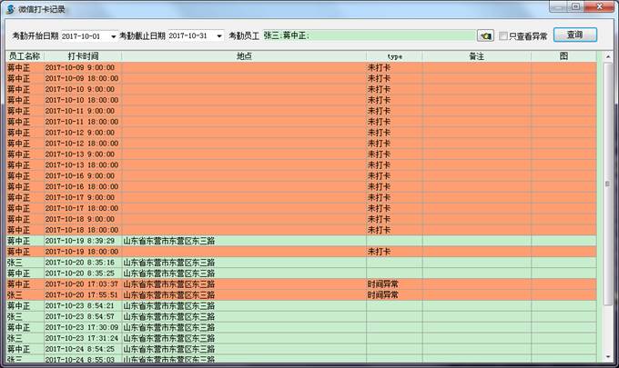 選擇好時(shí)間段,和考勤員工后,點(diǎn)擊查詢按鈕,出現(xiàn)如下圖所示