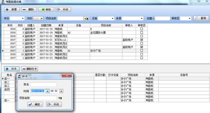 在考勤設(shè)備讀取操作界面也有相應(yīng)的查詢篩選項(xiàng),可以通過(guò)年份、月份、項(xiàng)目名稱、設(shè)備、來(lái)源、創(chuàng)建人、審核否等相關(guān)信息來(lái)篩選查詢從考勤設(shè)備讀取的信息。
