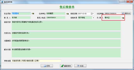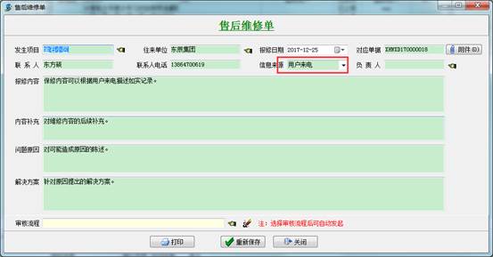 第一種情況:用戶直接來電,我方自行登記售后維修單;分管員接到用戶電話,根據(jù)用戶的描述手動添加【售后維修單】,填寫必要內(nèi)容,如發(fā)生項(xiàng)目,單位名稱,報(bào)修的內(nèi)容等,然后選擇審核流程方案,提交給售后部門經(jīng)理審批。