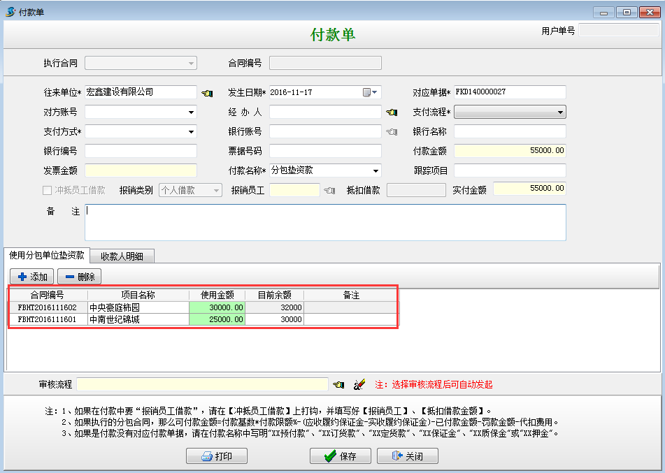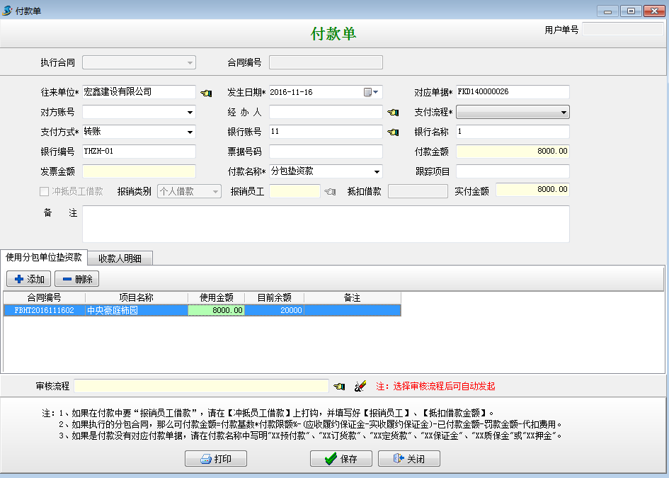 在【分包合同】-【墊資款記錄】處選擇執(zhí)行付款,或者在【財務管理】-【付款單收款單】新建付款單選擇墊資款付款。 選擇好支付方式和對應的付款銀行賬戶,并填寫好使用金額,點擊保存。